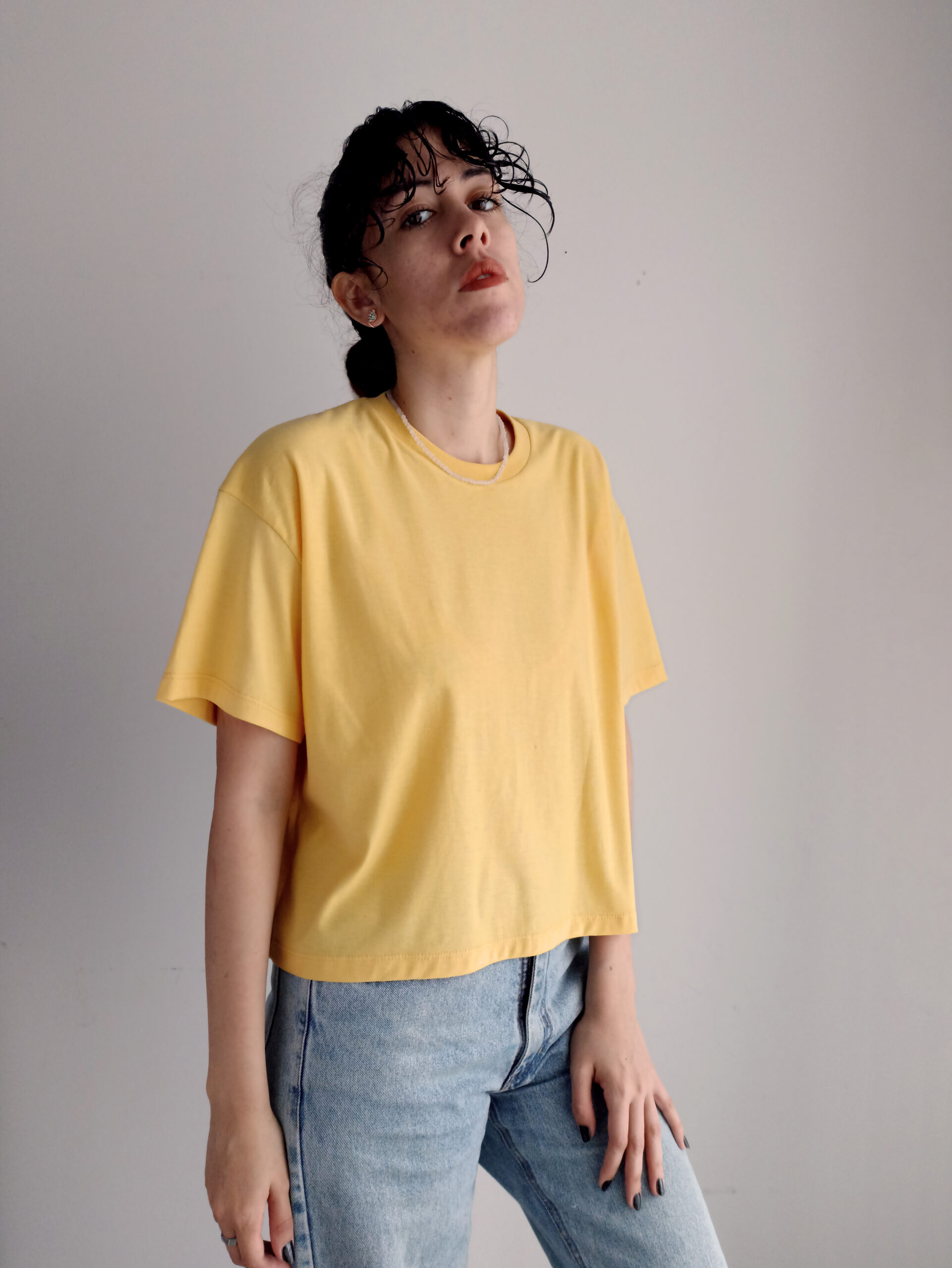 baby tee de calce al cuerpo, más corta y con mangas cortas.